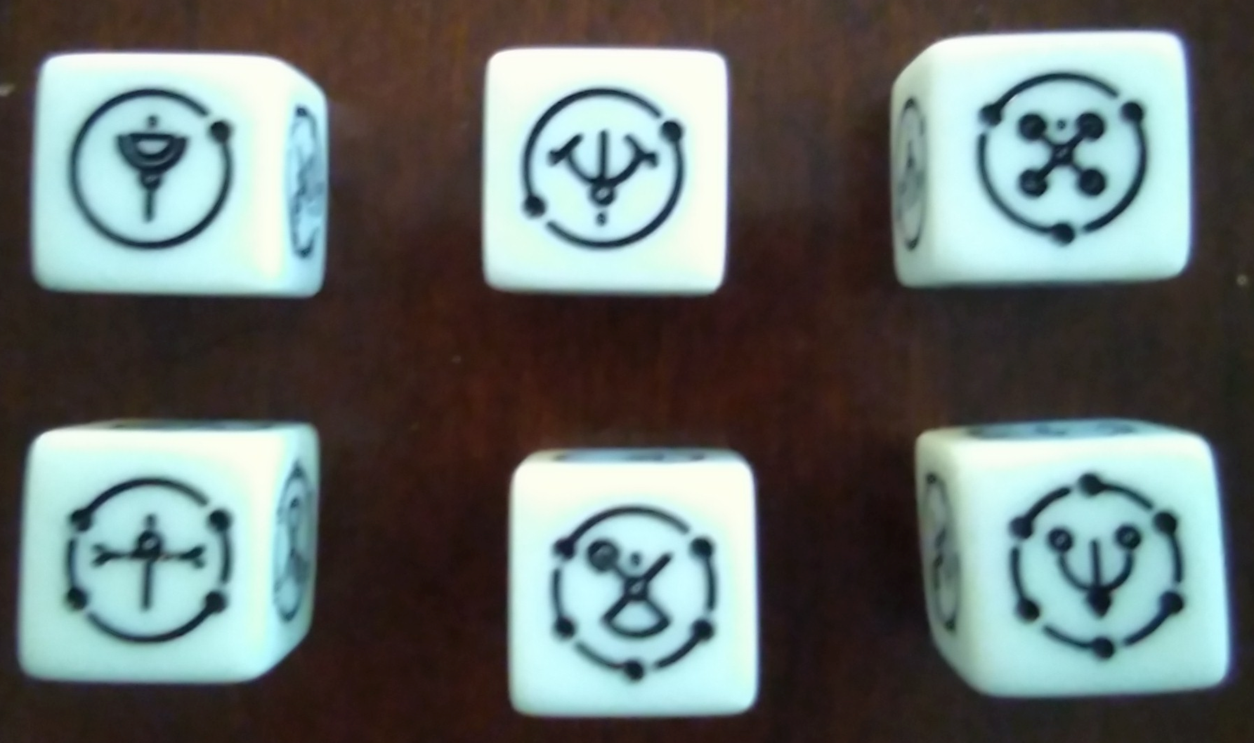 I received my copy as the fulfillment of the game’s Kickstarter; there was a long delay between funding and production, for several reasons, so the game hasn’t come fully to market yet. Production values seem solid; cardboard parts aren’t flimsy, and cards are decently stiff and slick-coated poker-sized. The game comes with six custom dice, but the customization is graphic rather than numeric; ordinary six-sided dice can be used if players have a ‘thing’ about not sharing dice. The included dice are slightly smaller and lighter than standard, but don’t give the impression of ‘cheap’ manufacture. The rulebook is of similar good quality production. There are some nice touches, such as player tokens having an abstract droyne drawn on them, and tracking your current honor score with two little wooden cubes in matching color.