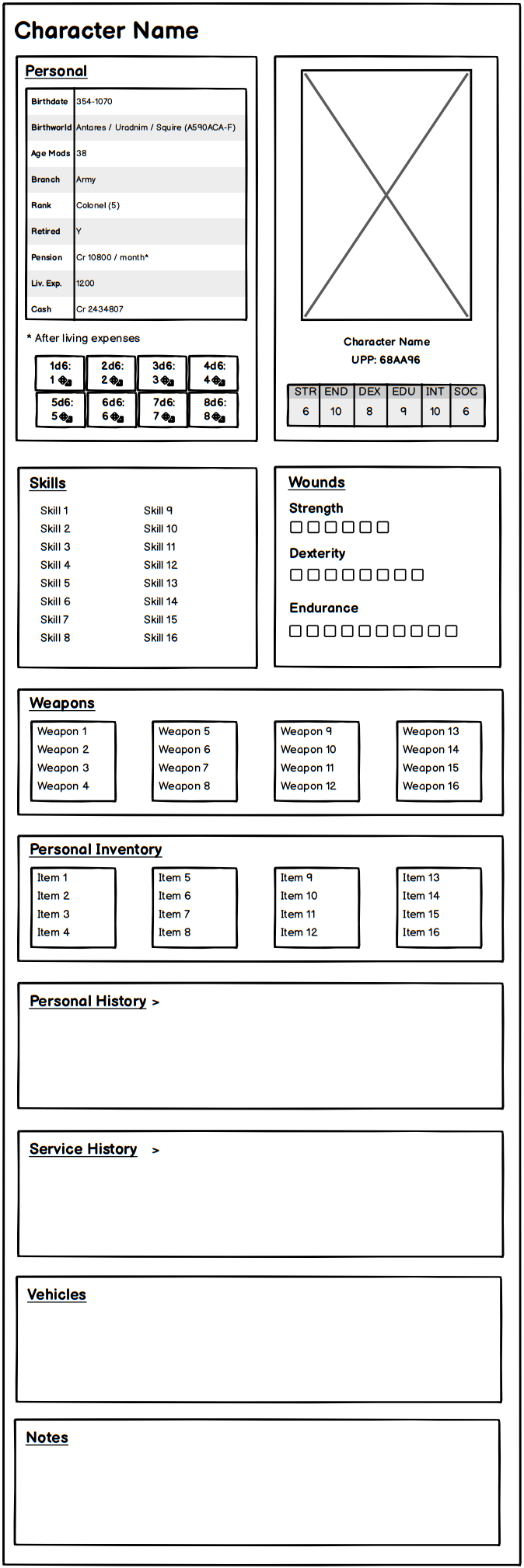 Per Figure 1, you will note that I have a “block” for personal background, a block for the portrait and basic stats, A block for skills, a block for a wounds tracker, and sections for weapons, personal equipment (inventory), personal history, service history, vehicles and a catch-all at the bottom for general notes. The die-roller was included in the personal background block more for aesthetic purposes and to make it readily available as die-rolling is an essential game mechanic.