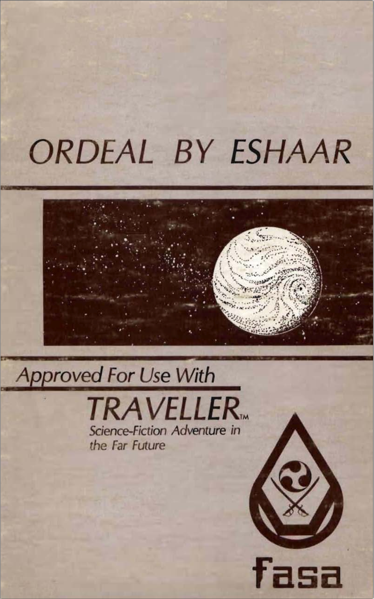 Ordeal by Eshaar is one of the early Traveller adventures from FASA; it does not seem to be as remembered in the community as some of FASA’s other adventures. It is credited to the Keith brothers, which I consider a good sign; the Keiths credit Jordan Weisman and Marc Miller for the concept on which they based this adventure.